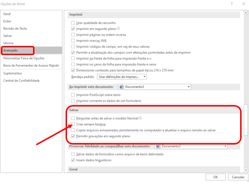Escolha a opção “Avançado” e procure por “Salvar”. Deixe habilitada a opção “Criar sempre backup”. Clique em “OK” para salvar suas opções.